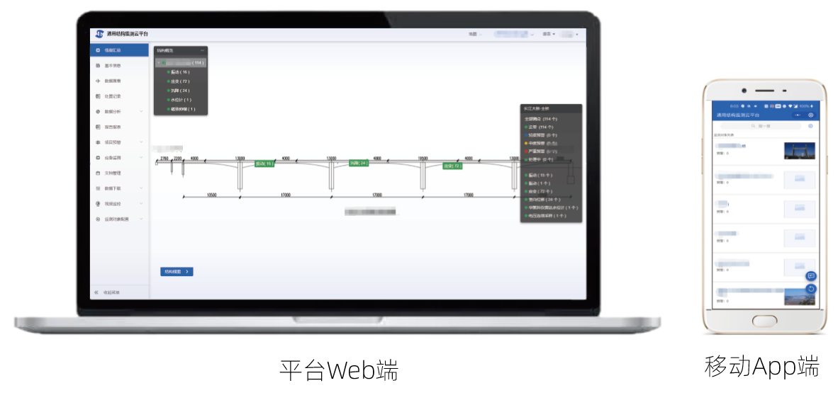 通用監(jiān)測平臺提供數(shù)據(jù)采集、數(shù)據(jù)可視化、數(shù)據(jù)監(jiān)控與數(shù)據(jù)服務等模塊,支持Web端與移動端隨時隨地查看監(jiān)測結(jié)構(gòu)健康狀態(tài)、監(jiān)測設(shè)備在線狀態(tài)、智能分析結(jié)果與安全評估報告;可通過郵件、短信、微信小程序等多種形式,實時接收并記錄監(jiān)測數(shù)據(jù)報警信息。